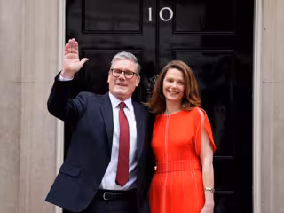 05 July 2024, United Kingdom, London: Newly elected UK Prime Minister Sir Keir Starmer stands with his wife Victoria Starmer at his official London residence at No 10 Downing Street for the first time after the Labour party won a landslide victory at - James Manning/PA Wire/dpa