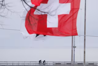 Archivo - Ciclistas junto a una bandera de Suiza en Basilea - MICHELE TANTUSSI - Archivo
