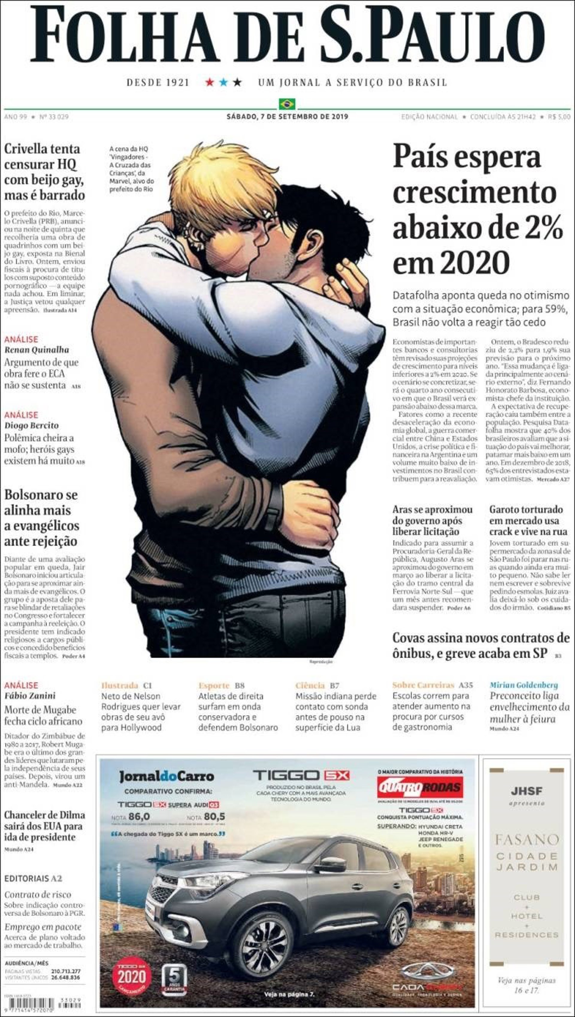 Portada de 'Folha de Sao Paulo' sobre la Bienal del Libro con dos hombres besándose sacada de la portada de un cómic de Marvel: 'Vengadores: la cruzada de los niños'. - FOLHA DE SAO PAULO