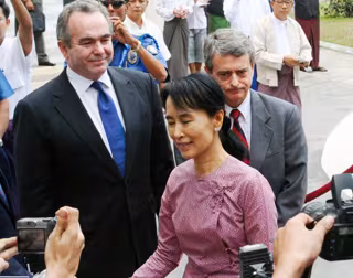 El encuentro se produjo en un hotel de la antigua capital birmana al que se desplazó Suu Kyi abandonando por un día el arresto domiciliario del que es objeto y en el que ha pasado prácticamente catorce los últimos 20 años.