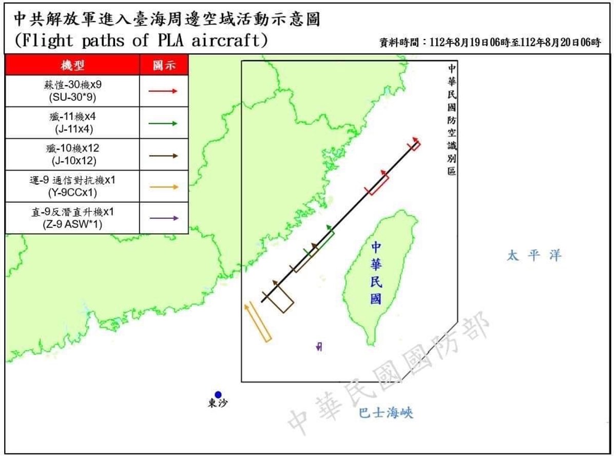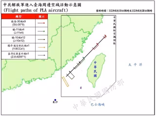 Mapa de la trayectoria del vuelo de los cazas del Ejército de la República Popular de China monitorizados por el Ministerio de Defensa de Taiwán - MINISTERIO DE DEFENSA DE TAIWÁN