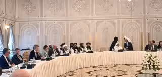 Archivo - Una delegación talibán encabezada por su ministro de Exteriores, Amir Jan Muttaqi, se reúne con representantes de EEUU, UE y otros países occidentales en Doha - TWITTER @QAHARBALKHI - Archivo