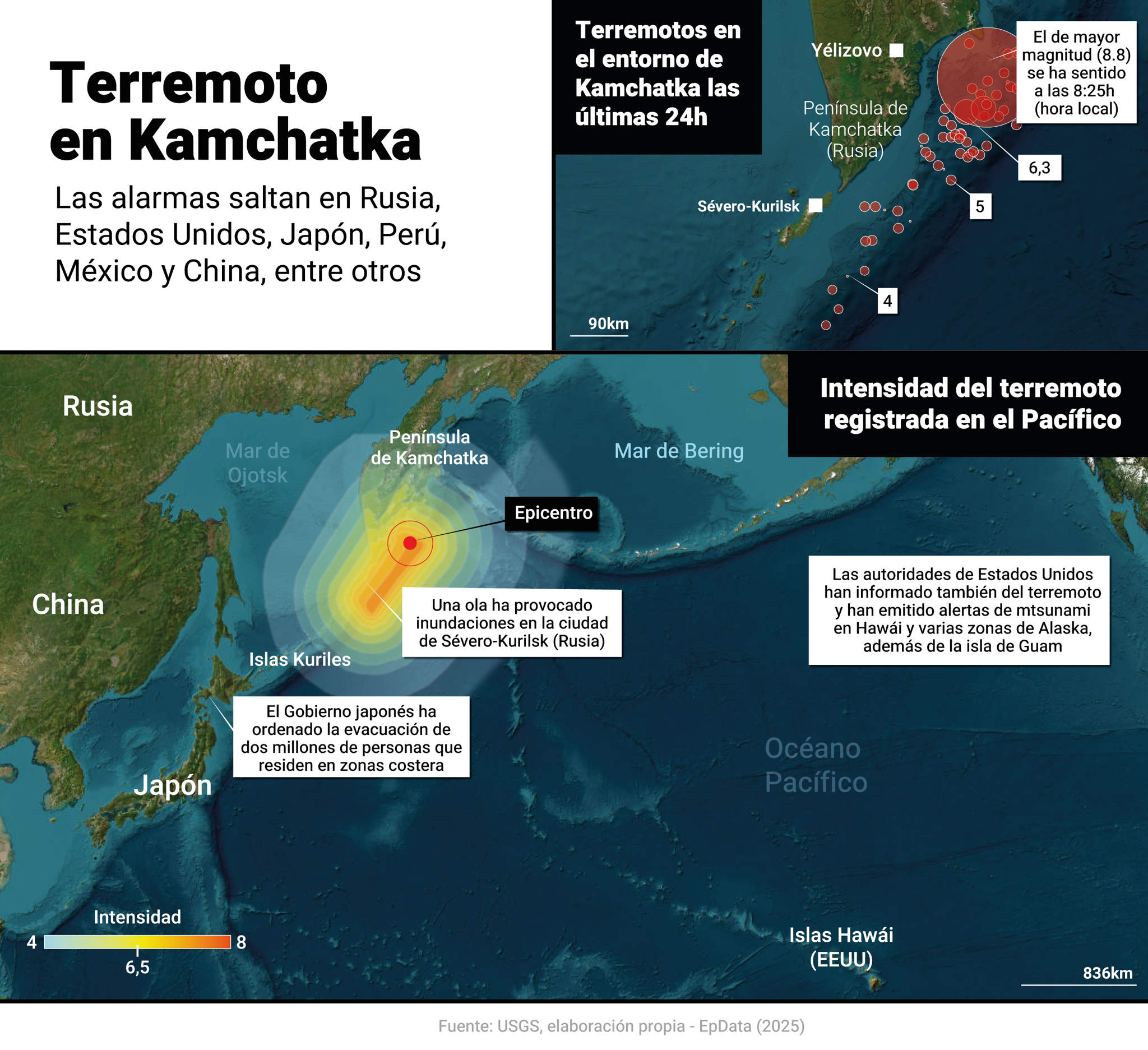 Un terremoto de magnitud 8,8 en la escala Richter ha sido registrado este miércoles en la península de Kamchatka, en el extremo oriental de Rusia, y ha provocado alertas de tsunami en gran parte del Pacífico, especialmente en territorio japonés, donde dos millones de personas han sido ya evacuadas.