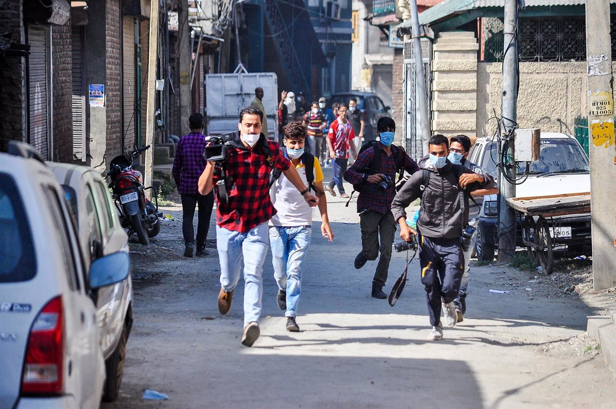 Un grupo de periodistas corre durante los enfrentamientos que tuvieron lugar en unas recientes manifestaciones en Cachemira por la muerte de tres personasa a manos de las autoridades de India. - SAQIB MAJEED / ZUMA PRESS / CONTACTOPHOTO