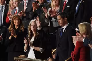 "Aquí, esta noche, se encuentra un hombre muy valiente que lleva consigo las esperanzas, los sueños y las aspiraciones de todos los venezolanos. Uniéndose a nosotros entre los presentes está el verdadero y legítimo presidente de Venezuela, Juan Guaidó", ha anunciado Trump.