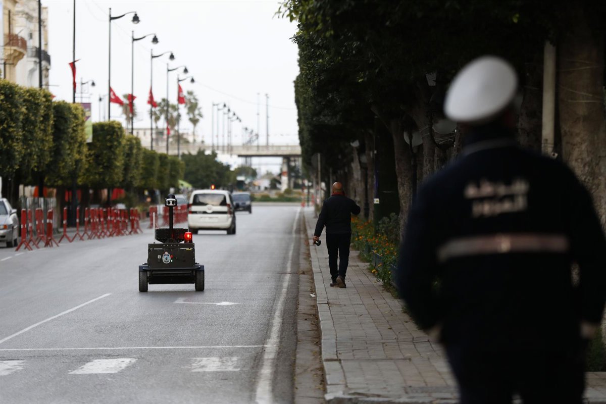 Archivo - Un policía en Túnez junto a un robot encargado de comprobar si se cumple el confinamiento por coronavirus - Khaled Nasraoui/dpa - Archivo