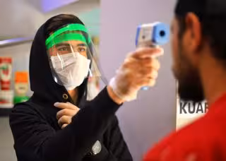 Un dependiente de una tienda en Turquía toma la temperatura a un cliente. - Mahmoud abu Salama
