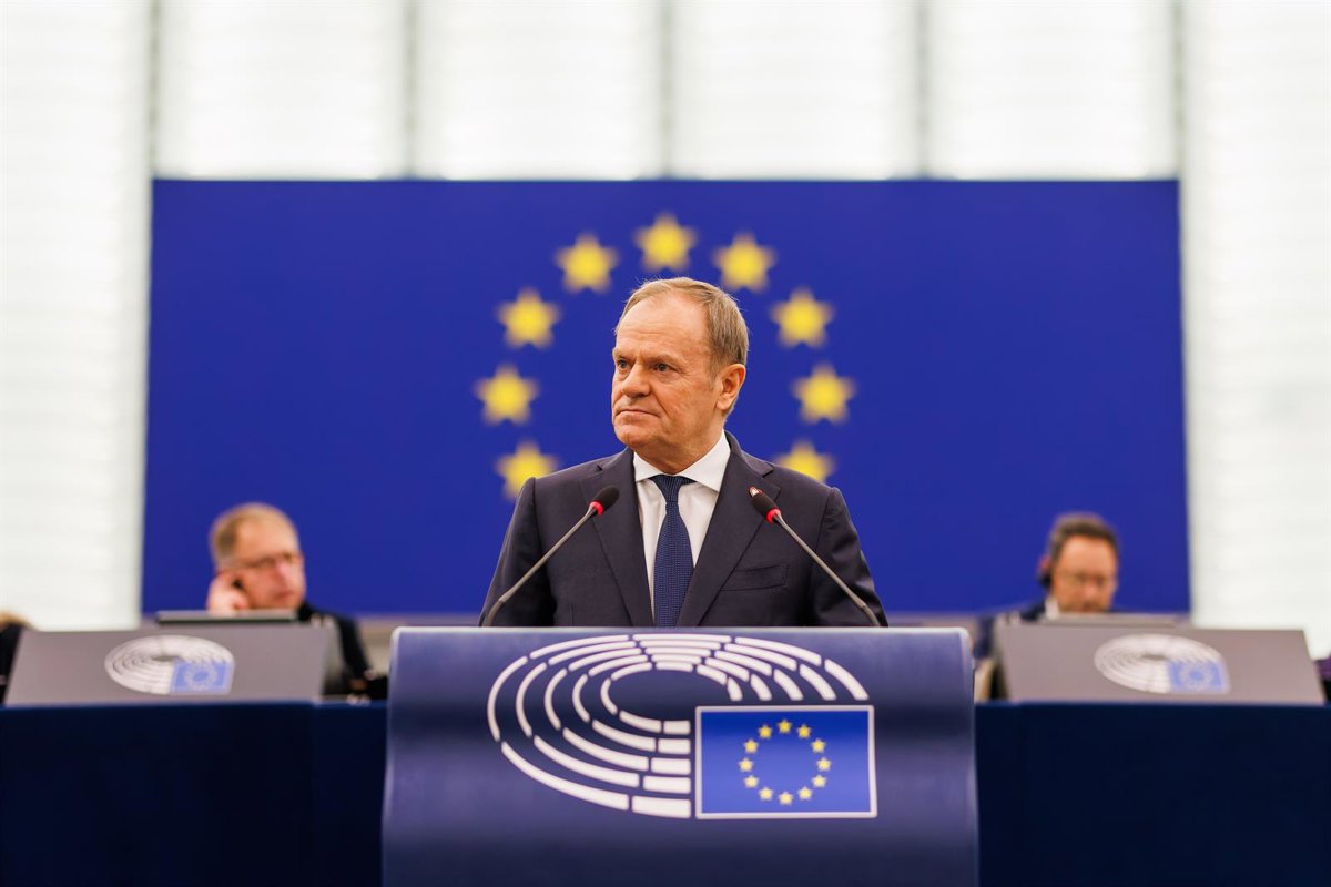 Archivo - El primer ministro de Polonia, Donald Tusk, pronuncia en enero un discurso ante el Parlamento Europeo - Philipp von Ditfurth/dpa - Archivo