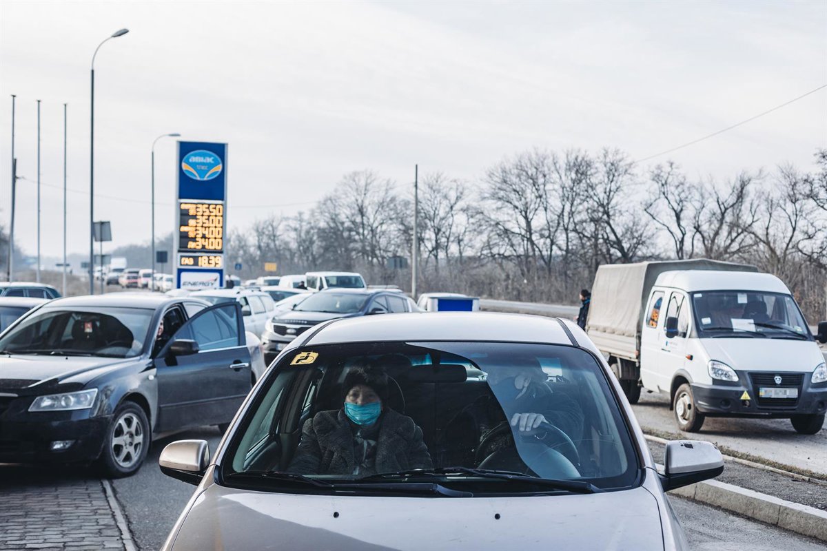 Vehículos en Kramatorsk, situado en el óblast de Donetsk, al oriente de Ucrania, acuden a una gasolinera, en Kramatorsk (Ucrania). La población ucraniana se está desplazando a puntos más seguros tras registrarse varias explosiones en distintas ciudades. - Diego Herrera - Europa Press
