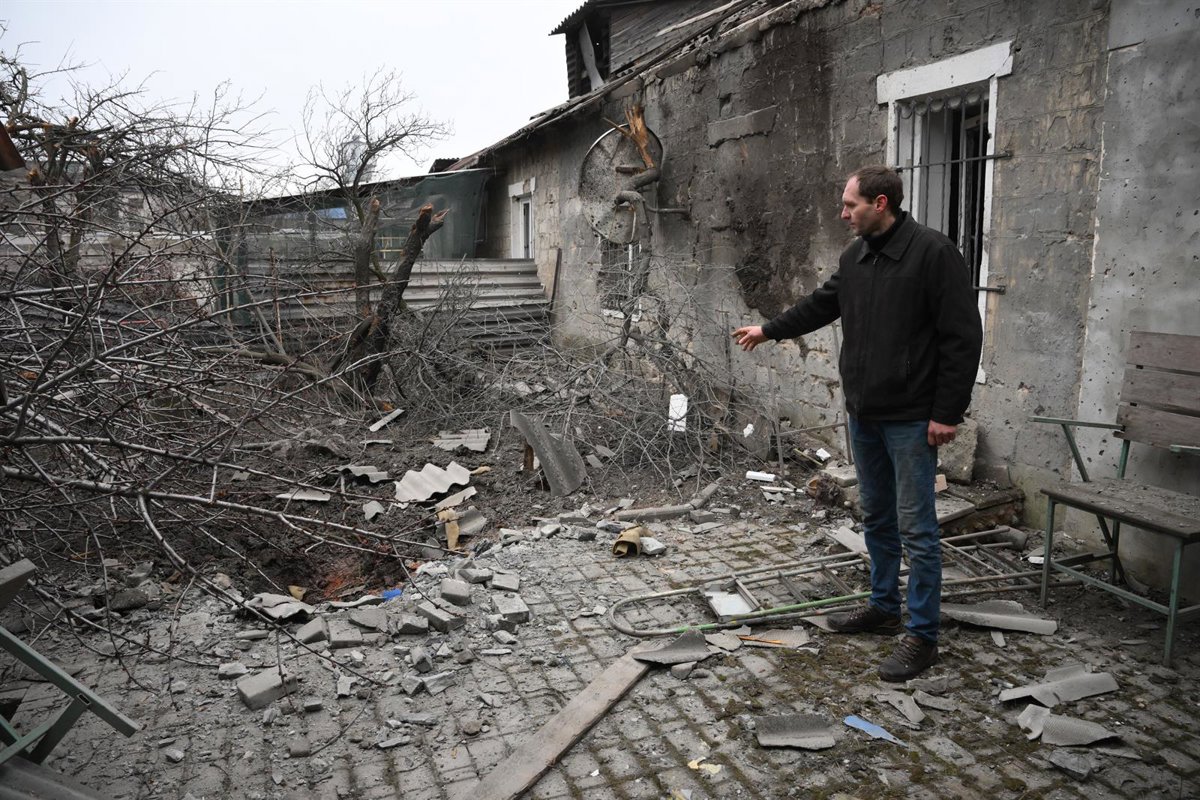 Un hombre muestra el cráter de la explosión de un proyectil en su patio tras un reciente bombardeo, en Donetsk, República Popular de Donetsk. - Ilya Pitalev / Sputnik / ContactoPhoto