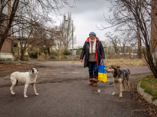 February 8, 2024, Nju-Jork, Ukraine: Woman seen walking with her two dogs to get food from humanitarian aid. Toretsk is a mining town in the eastern Ukraine, turned into scratch by shelling. Russian positions are just few kilometres away. There is no elec - Europa Press/Contacto/Jana Cavojska