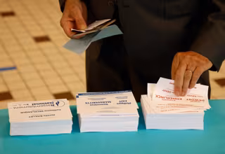 20 June 2021, France, Cucq: A voter takes ballots papers at a polling station in Cucq, Northern France, for the first round of the French regional elections. The regional elections are the last nationwide decision before the French presidential election - Ludovic Marin/AFP/dpa