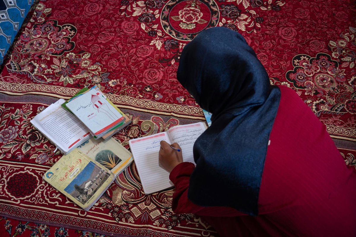 Wahida, una afgana de catorce años, estudiando en su casa tras quedar fuera de la escuela por la prohibición de los talibán a que las niñas reciban educación secundaria y superior en Afganistán - MUZAMEL AZIZI/UNICEF