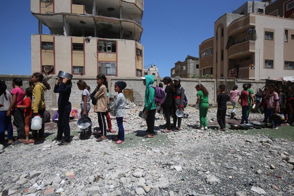 Desplazados palestinos hacen cola para recibir ayuda en Nuseirat, en la Franja de Gaza - Europa Press/Contacto/Omar Ashtawy