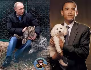 La polémica imagen muestra a Obama sosteniendo un pequeño perro blanco mientras, a su lado, Putin abraza a un cachorro de leopardo. La fotografía del mandatario ruso corresponde a una visita realizada a Sochi el año pasado, mientras que la de Obama data de su campaña para senador.