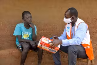 Un trabajador de World Vision entrega una radio a un niño en Uganda - WVU / AGGREY NYONDWA