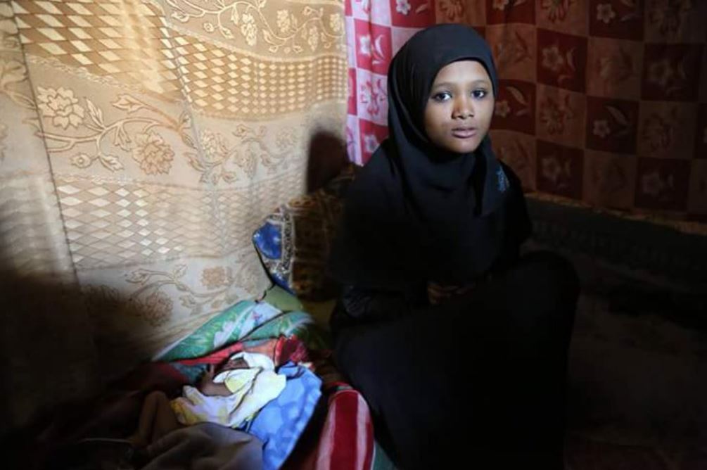 Dentro de una de las chabolas, Entisar, de 16 años, está sentada jugando con su hija de un mes, Rahma, que está gravemente malnutrida. Casada el año pasado con un chico no mucho mayor que ella, Entisar no tiene dinero para llevar a Rahma al hospital. La familia huyó de Haradh hace seis meses cuando comenzaron los combates. Su marido ahora trabaja como barrendero y la mayoría de su salario se va a pagar el alquiler de su casa de una sola habitación.