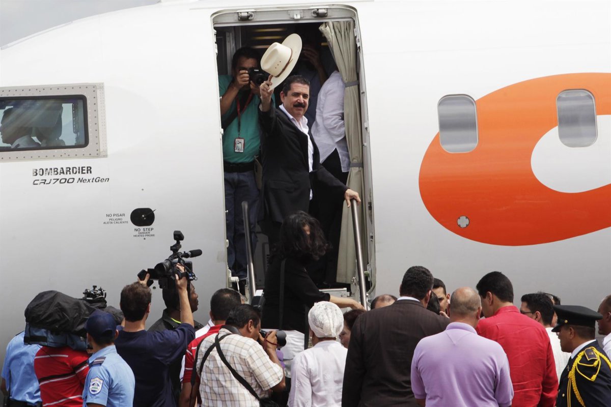 Zelaya celebró su llegada al aeropuerto y dijo que "inmediatamente" realizarán los trámites de migración y aduana. "Luego estaremos acompañando al pueblo y la marcha que en forma de voluntaria está aquí, igual como cuando vinieron a despedirme cuando me fui al exilio hace 17 meses", ha indicado.