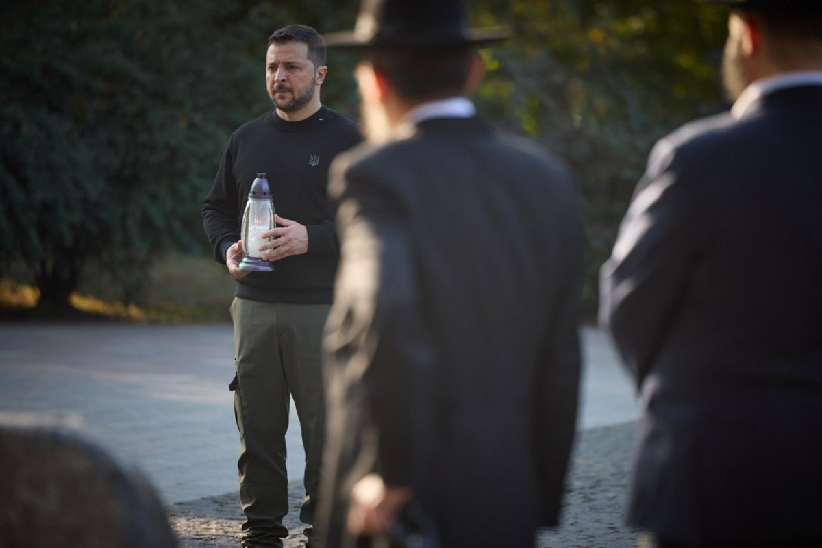 El presidente Zelenski ha colocado un farolillo junto a un cartel conmemorativo del Holocausto en la Reserva Nacional Histórica y Conmemorativa de Babi Yar, lugar donde soldados de la Alemania nazi acabaron con la vida de miles de judíos ucranianos en 1941.