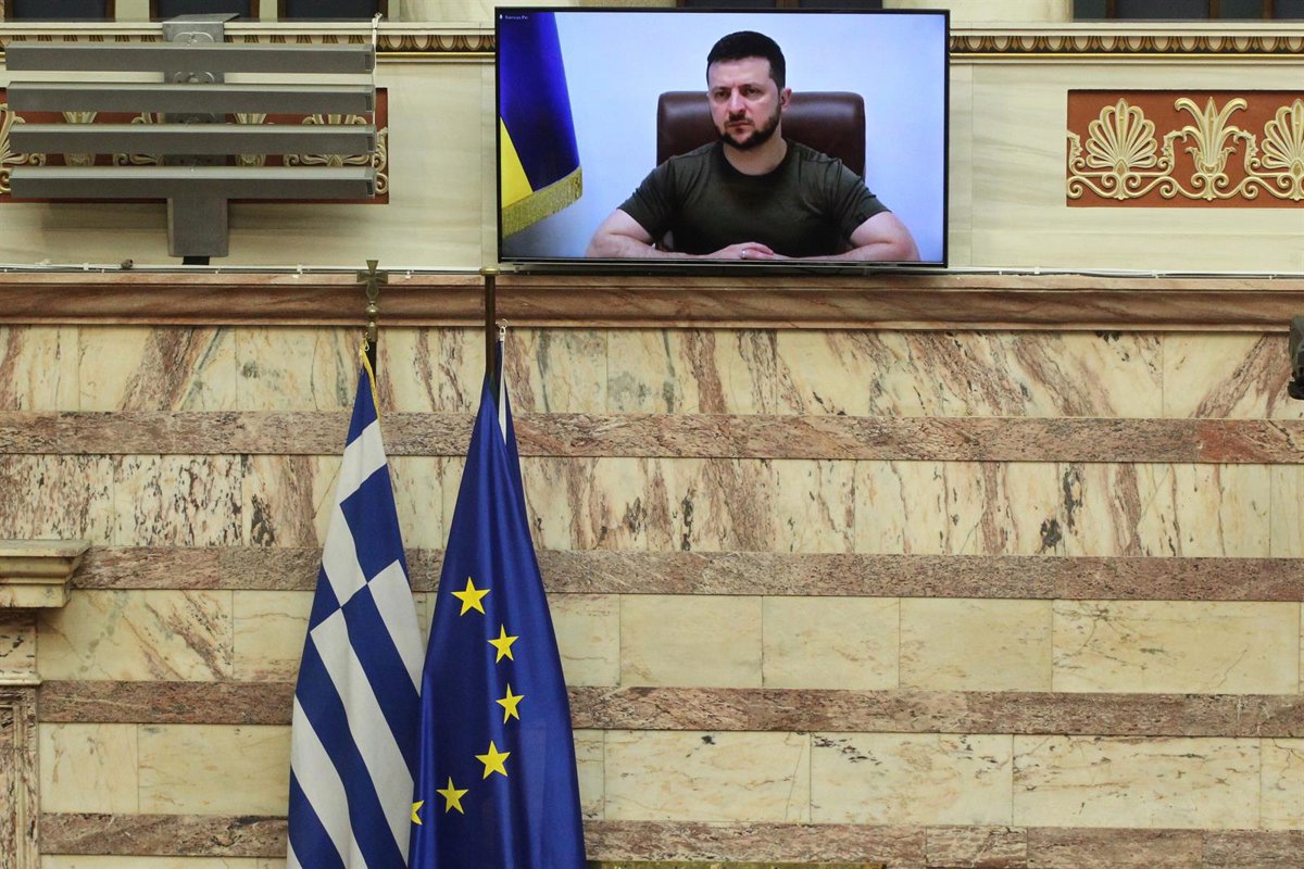 07 April 2022, Greece, Athens: Ukrainian President Volodymyr Zelesnky delivers a transmitted speech to the Greek Parliament. Photo: Aristidis Vafeiadakis/ZUMA Press Wire/dpa - Aristidis Vafeiadakis/ZUMA Press / DPA