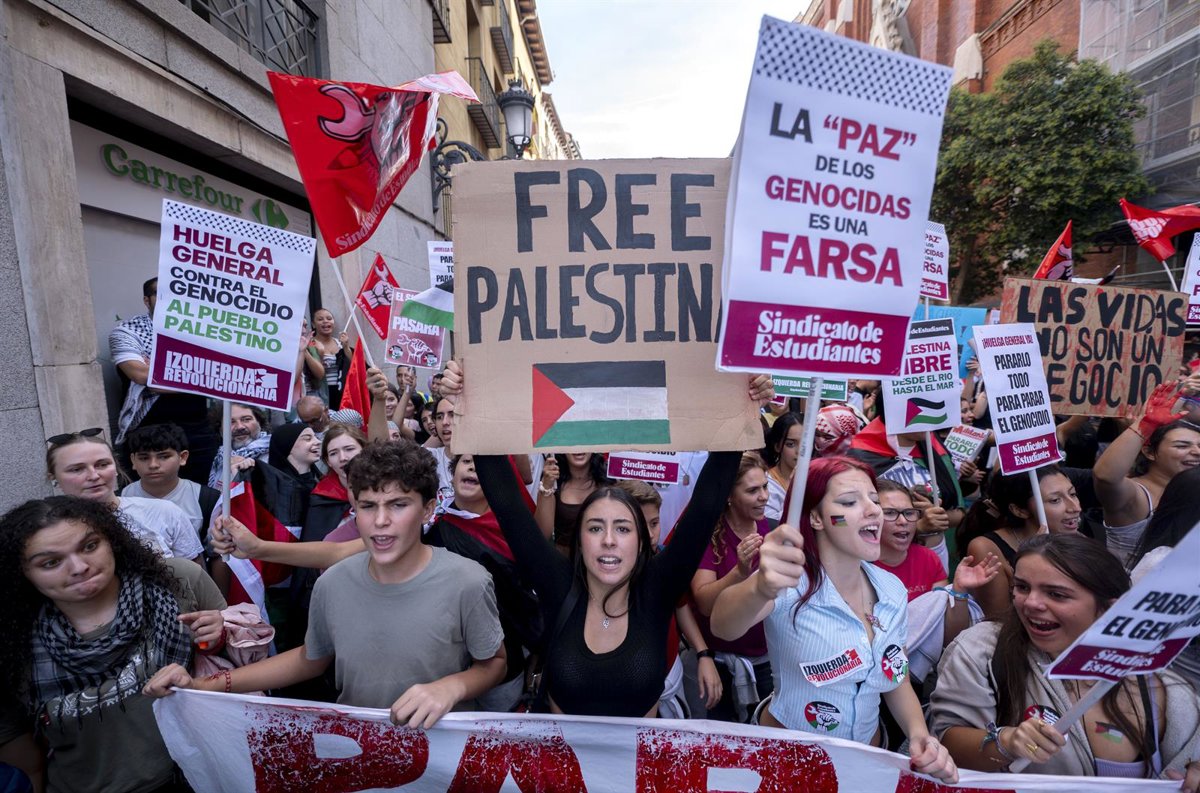 Manifestantes portan pancartas con lemas 'Free Palestina', 'Huelga general contra el genocidio al pueblo palestino' y 'La paz de los genocidas es una farsa' durante la concentración por Palestina, a 15 de octubre de 2025, en Madrid (España). - Alberto Ortega - Europa Press