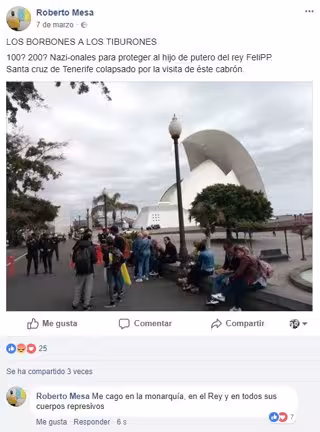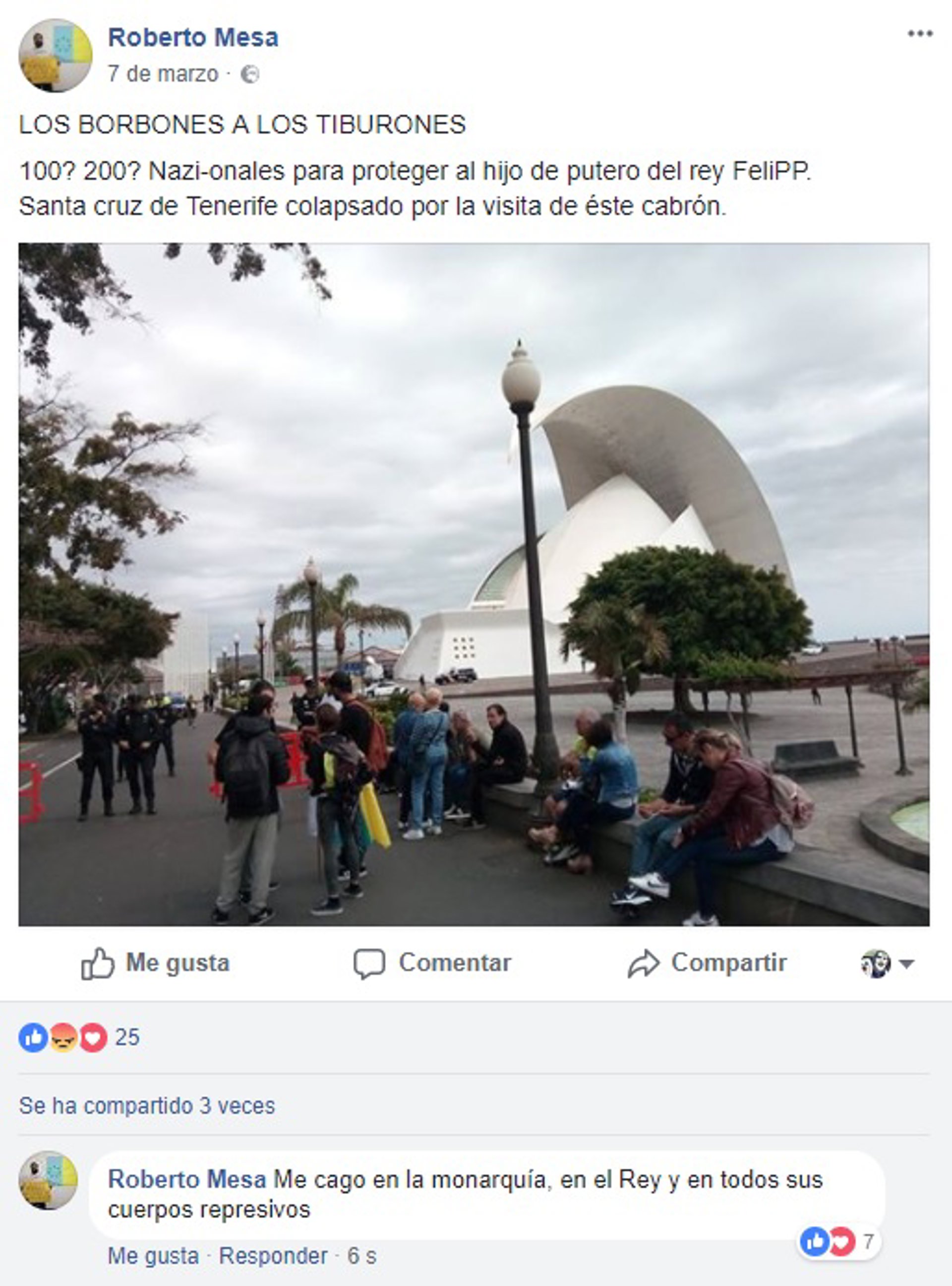 Aunque se trata de una causa compleja y declarada secreta, han precisado fuentes judiciales, a Mesa se la achacan, entre otras cosas, determinados mensajes difundidos a través de su perfil de Facebook como "Los borbones a los tiburones" o "Me cago en la monarquía, en el Rey y en todos sus cuerpos represivos".