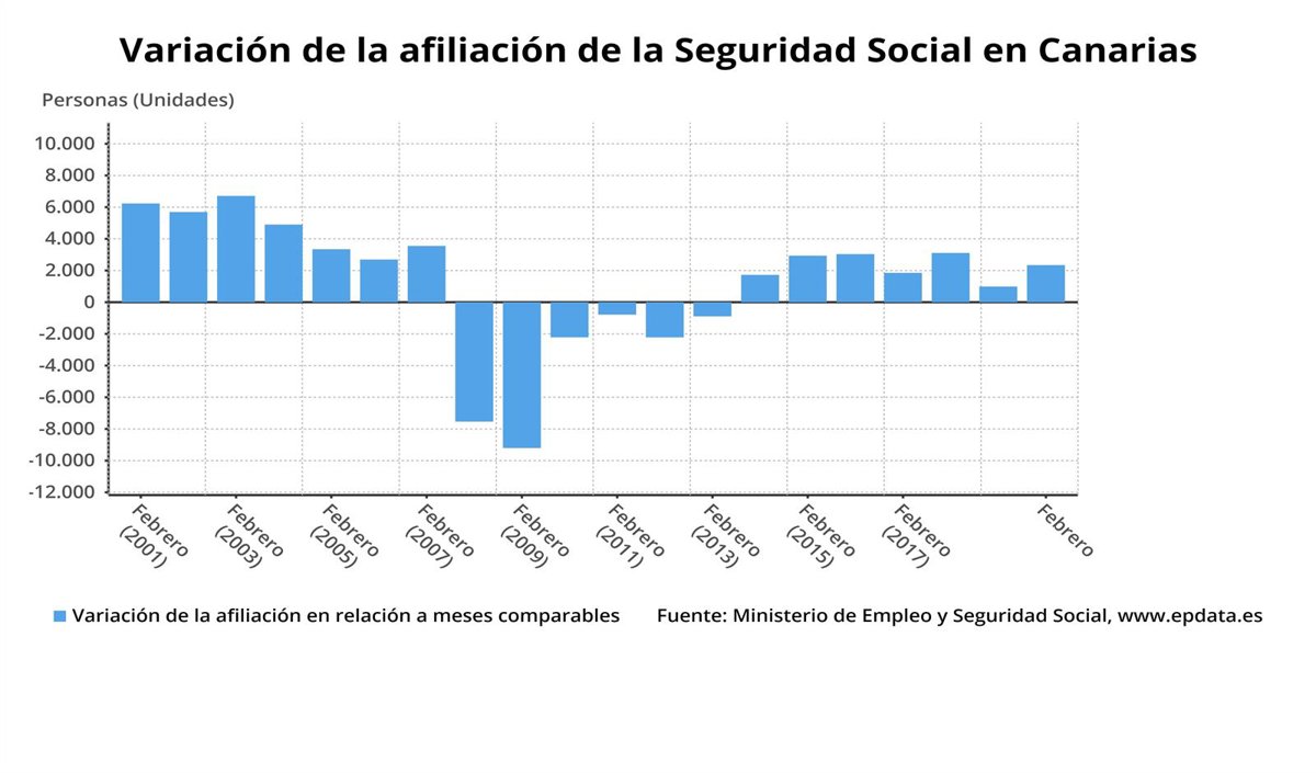 La Seguridad Social ha cerrado el mes de febrero en Canarias con un total de 818.141 afiliados, lo que supuso un aumento de 2.341 personas, que porcentualmente implicó un incremento del 0,29 por ciento con respecto a enero de 2020, según datos del Ministerio de Inclusión, Seguridad Social y Migraciones publicados este martes.