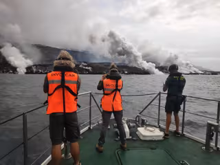 Científicos del Involcan toman medidas de SO2 del delta lávico del volcán de La Palma desde una patrullera de la Guardia Civil - INVOLCAN