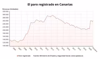 El número de parados registrados en las oficinas de los servicios públicos de empleo (antiguo Inem) en Canarias se sitúa actualmente en 262.487 personas, lo que ha supuesto un incremento de 8.207 desempleados más en octubre en relación al mes anterior (+3,23%).