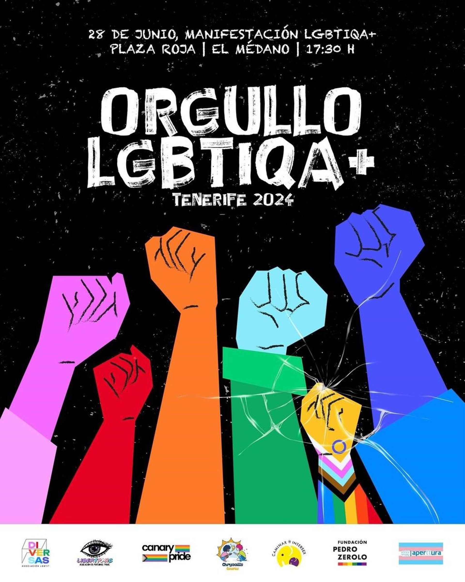 Las asociaciones LGBTIQA+ de la isla de Tenerife (Diversas, Chrysallis Canarias, Caminar Intersex, Libertrans, CanaryPride y Aperttura) se han unido este año para convocar conjuntamente la manifestación insular del Orgullo LGBTIQA+, que tendrá lugar este viernes día 28 de junio a las 17.30 horas en El Médano, en el municipio de Granadilla de Abona, bajo el lema 'Nuestro orgullo, nuestra lucha: juntes y visibles'.