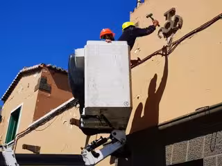 Un operario destruye a martillazos un símbolo relacionado con el franquismo, un 'vítor', junto a otro rótulo en presunto "cumplimiento de la Ley de Memoria Histórica" - Ayuntamiento de Ingenio