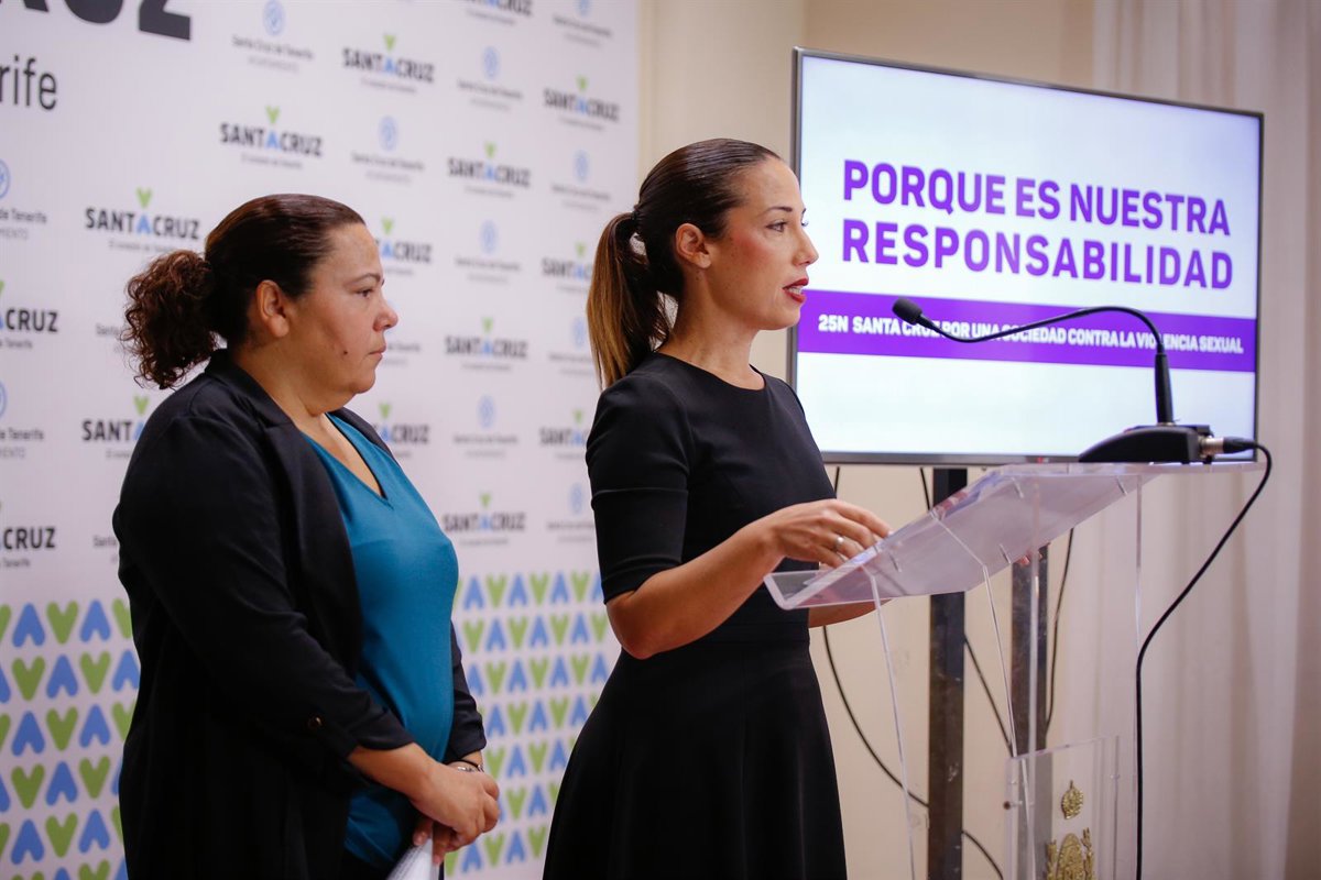 La alcaldesa de Santa Cruz de Tenerife, Patricia Hernández, junto a la concejal responsable de Igualdad, Ana Delia Darias, ha dado a conocer este viernes en rueda de prensa la campaña que el Ayuntamiento ha ideado para la sensibilización contra la violencia de género, dentro de los actos enmarcados en conmemoración del 25 de noviembre.