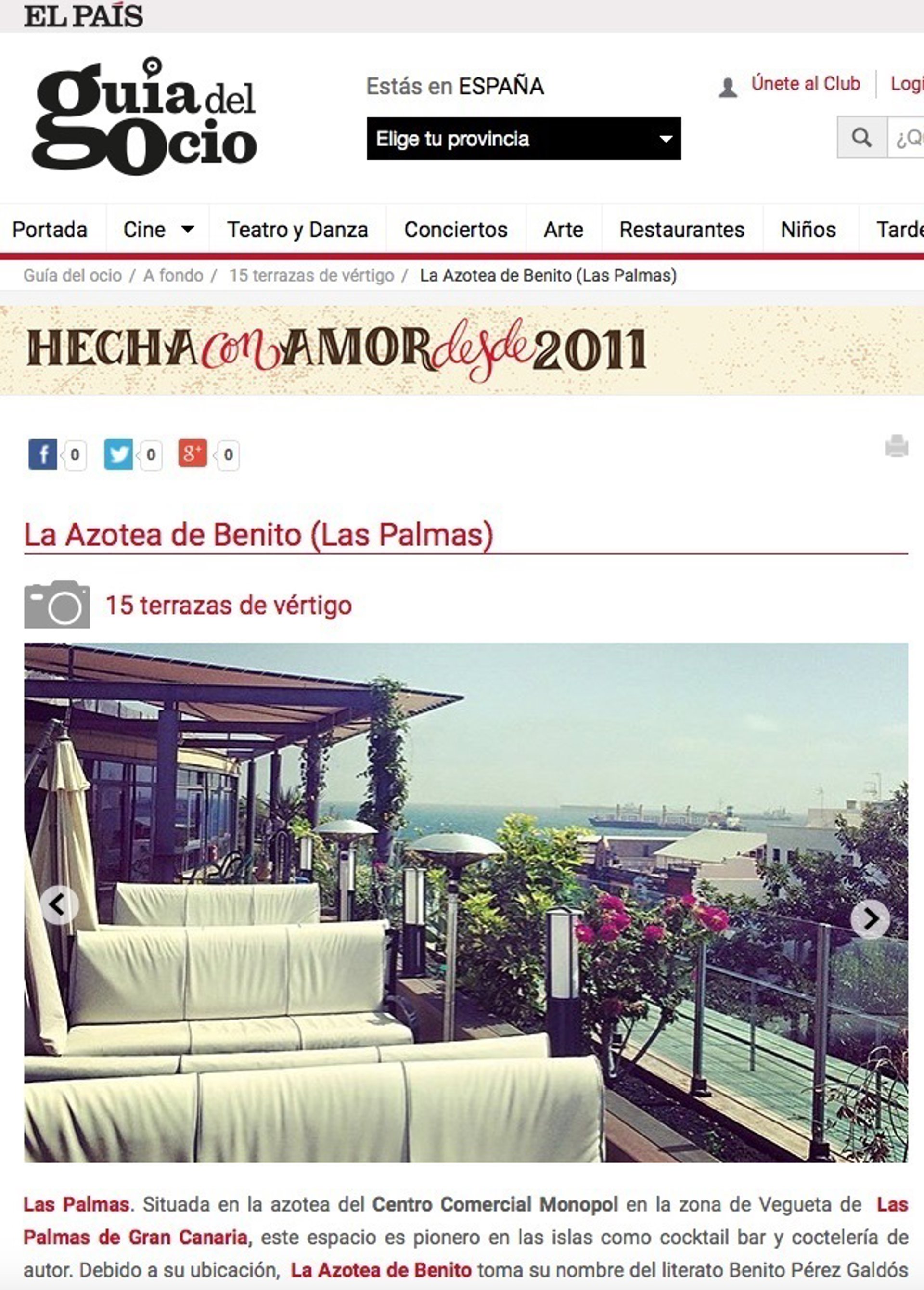 La Guía del Ocio de El País ha situado a La Azotea de Benito, en el Centro Comercial Monopol de Las Palmas de Gran Canaria, entre las 15 mejores terrazas con vistas de España, según ha informado el Ayuntamiento capitalino en una nota de prensa en la que añade que este establecimiento destaca por ser pionero en las islas como cocktail bar y coctelería de autor.