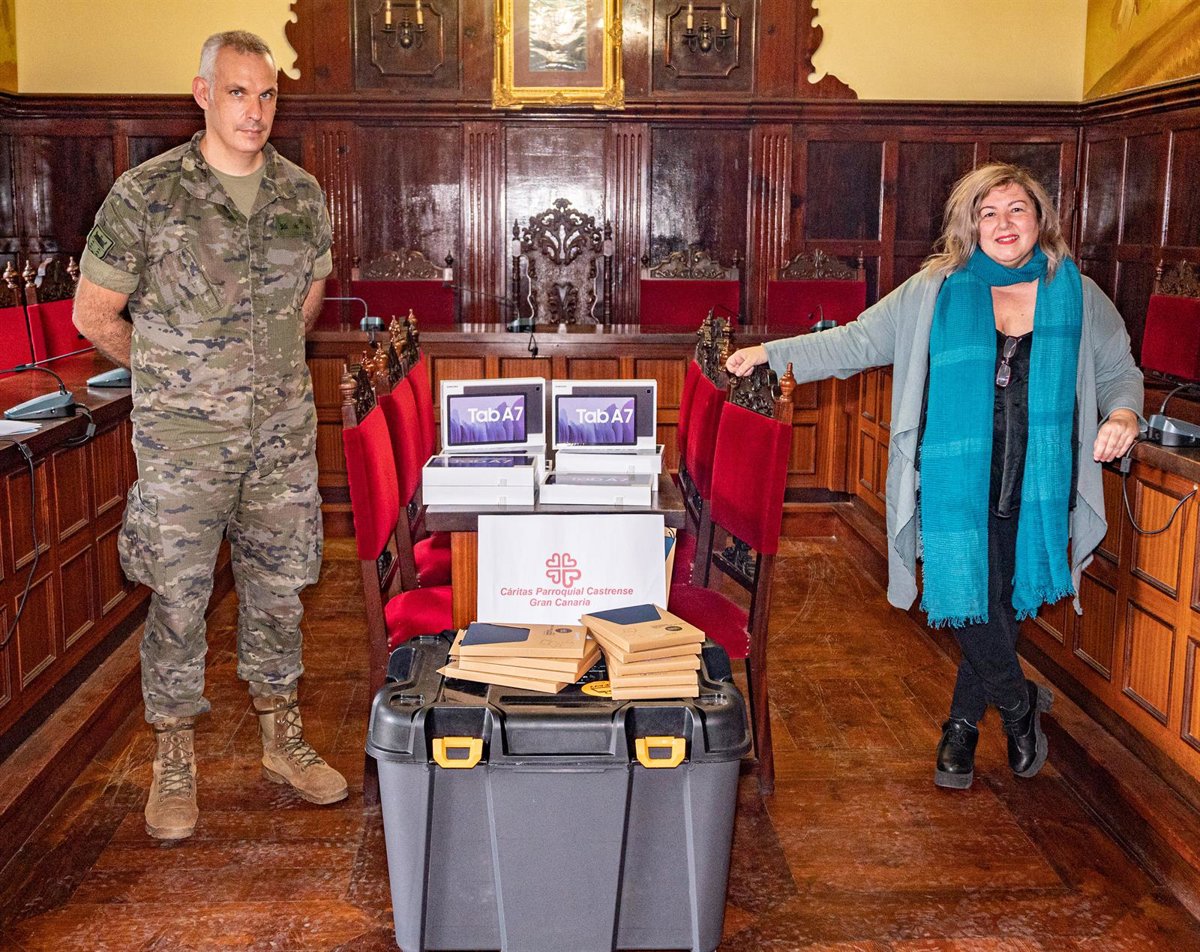 La Brigada 'Canarias' XVI (BRICAN XVI), colaborando con Cáritas Parroquial Castrense de Gran Canaria, realizó el pasado 29 de noviembre la entrega de 22 tablets al Ayuntamiento de Los Llanos de Aridane, uno de los afectados por la erupción del volcán.