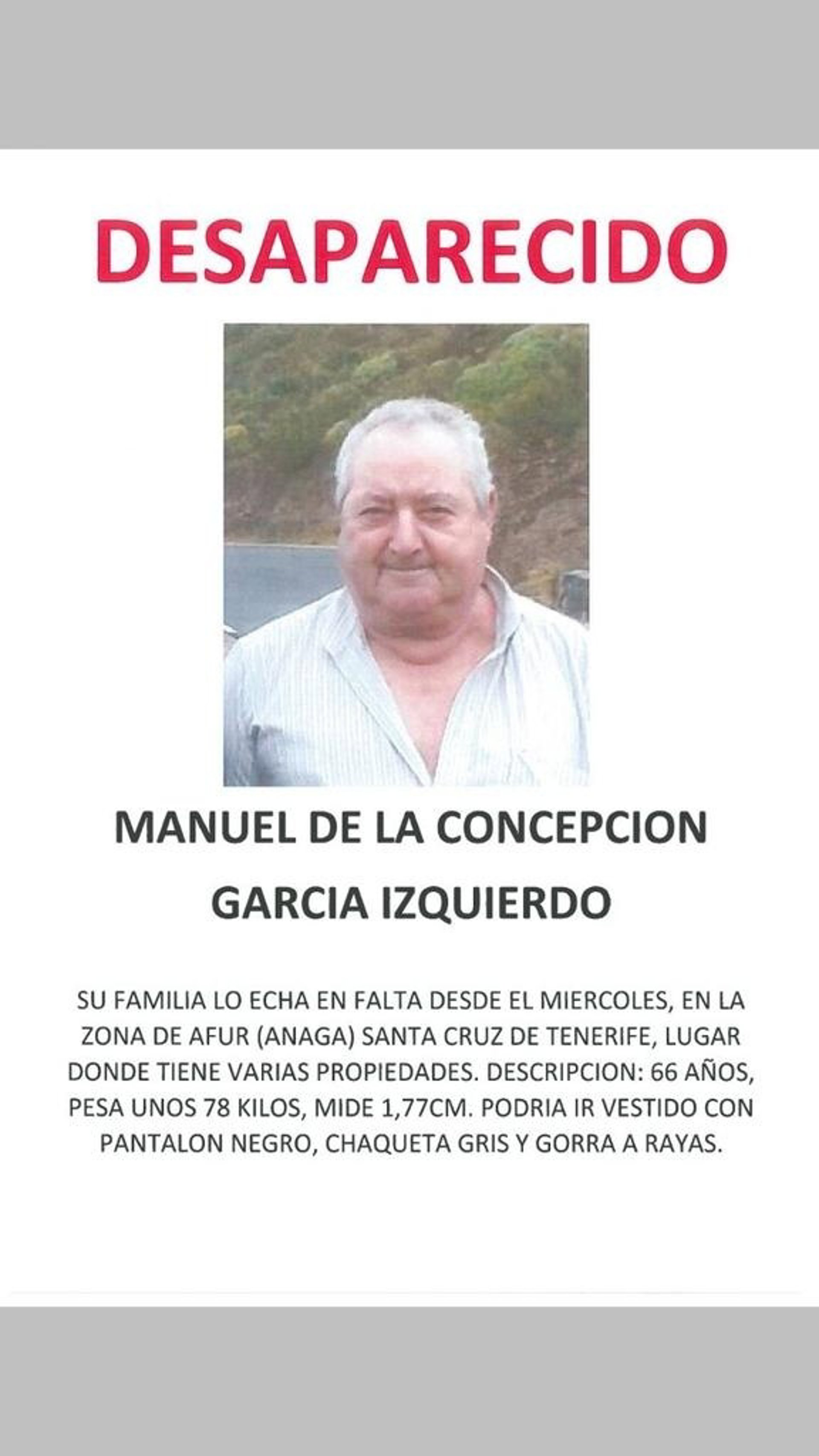 Este domingo se ha activado la búsqueda de Manuel de la Concepción García Izquierdo, un hombre de 66 años que ha desaparecido en la zona de Afur, en el Parque Rural de Anaga, donde tiene varias propiedades, según han informado fuentes de la Policía Local de Santa Cruz de Tenerife.