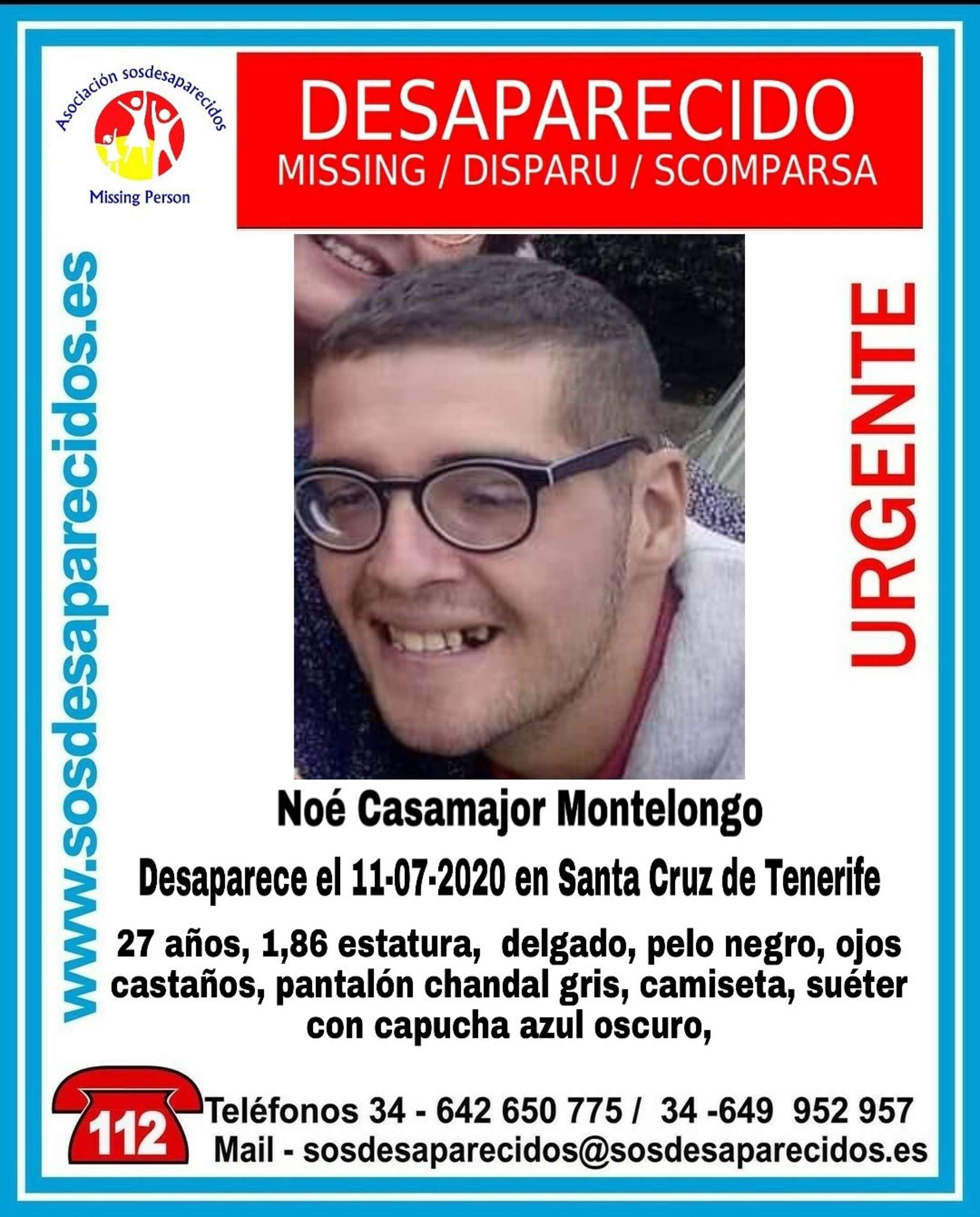 La Asociación 'sosdesaparecidos' y la Guardia Civil han lanzado un mensaje de ayuda para tratar de localizar a Noé Casamajor Montelongo, un joven de 27 años desaparecido en Santa Cruz de Tenerife, según han informado a través de sus cuentas oficiales de Twitter.
