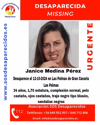 La asociación 'sosdesaparecidos' ha lanzado un mensaje de ayuda para tratar de localizar a Janice Medina Pérez, una mujer de 34 años desaparecida en Las Palmas de Gran Canaria, según ha informado a través de su cuenta oficial de Twitter.