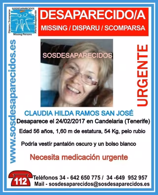 La asociación 'sosdesaparecidos' ha lanzado un mensaje de ayuda para tratar de localizar a Claudia Hilda Ramos San José, una mujer de 56 años desaparecida en el municipio de Candelaria, en Tenerife, según ha informado a través de su cuenta oficial de Twitter.