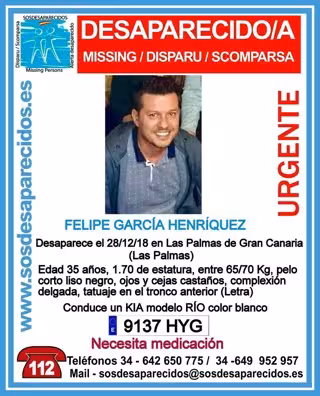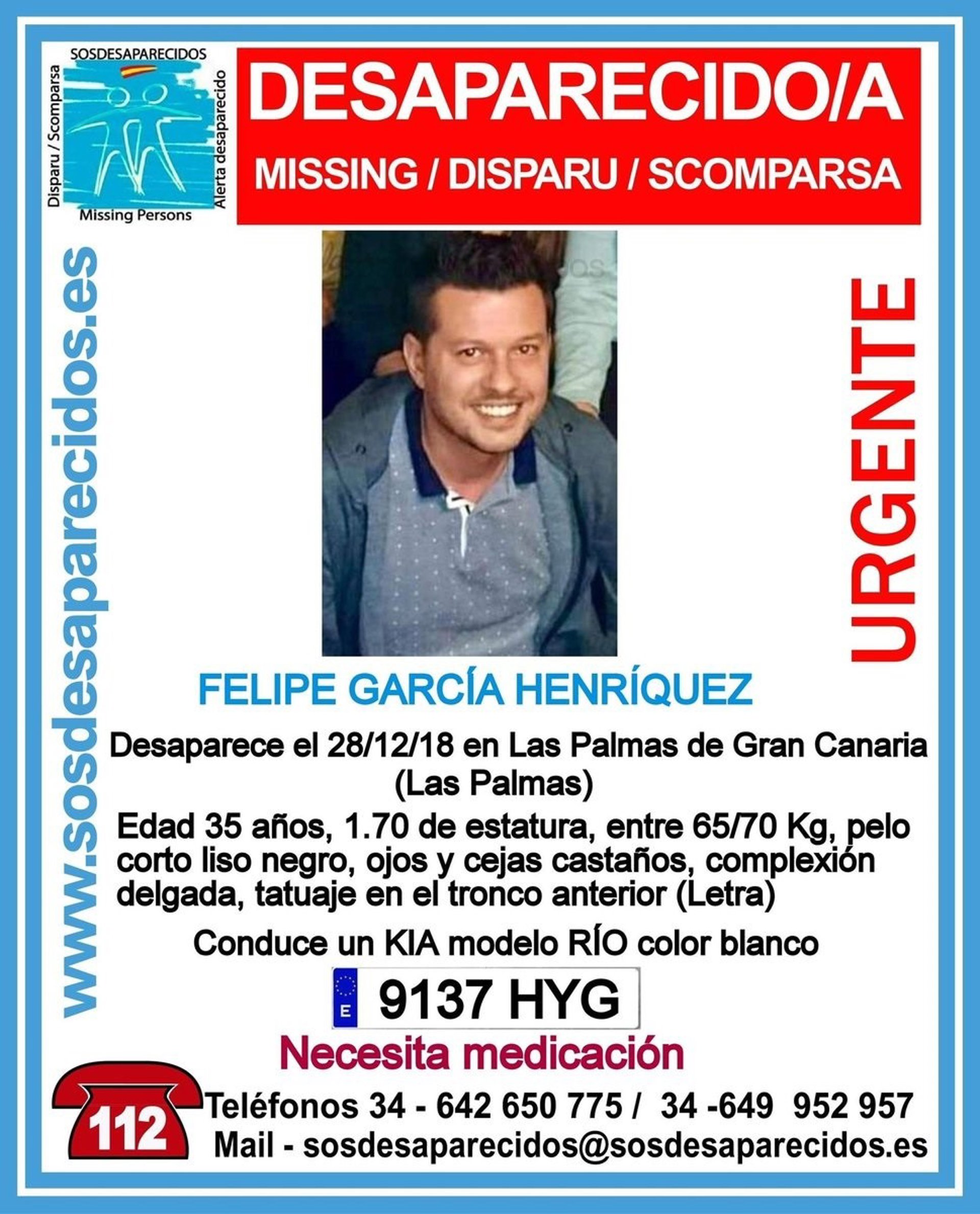 La asociación 'sosdesaparecidos' ha lanzado un mensaje de ayuda para tratar de localizar a Felipe García Henríquez, un varón de 35 años desaparecido en Las Palmas de Gran Canaria, según ha informado a través de su cuenta oficial de Twitter.
