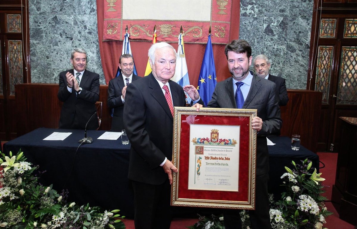 El presidente del Cabildo de Tenerife, Carlos Alonso, entregó en la noche de este martes el título de 'Hijo Ilustre de la isla de Tenerife' a Lorenzo Dorta García.