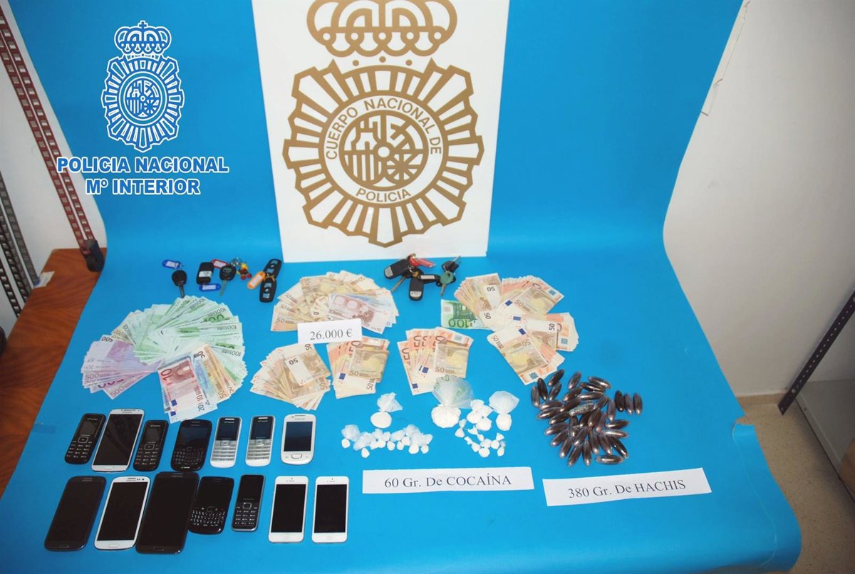 En el registro de cuatro domicilios se han intervenido unos 27.000 euros procedentes de la venta de droga, 59 gramos de cocaína, 373 gramos de hachís, útiles para el tratamiento y dosificación de la droga, además de cinco vehículos de alta gama y diversa documentación.