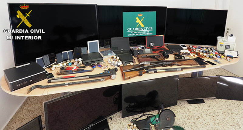 Durante estos registros se recuperaron tres escopetas, las cuales habían sido sustraídas en un domicilio de la localidad de Icod de los Vinos, así como multitud de objetos presuntamente sustraídos de las viviendas objetos de los robos tales como teléfonos móviles, objetos electrónicos, piezas de joyería, relojes, dinero en efectivo, una motocicleta, dos turismos y diversas herramientas utilizadas para la comisión de los robos.