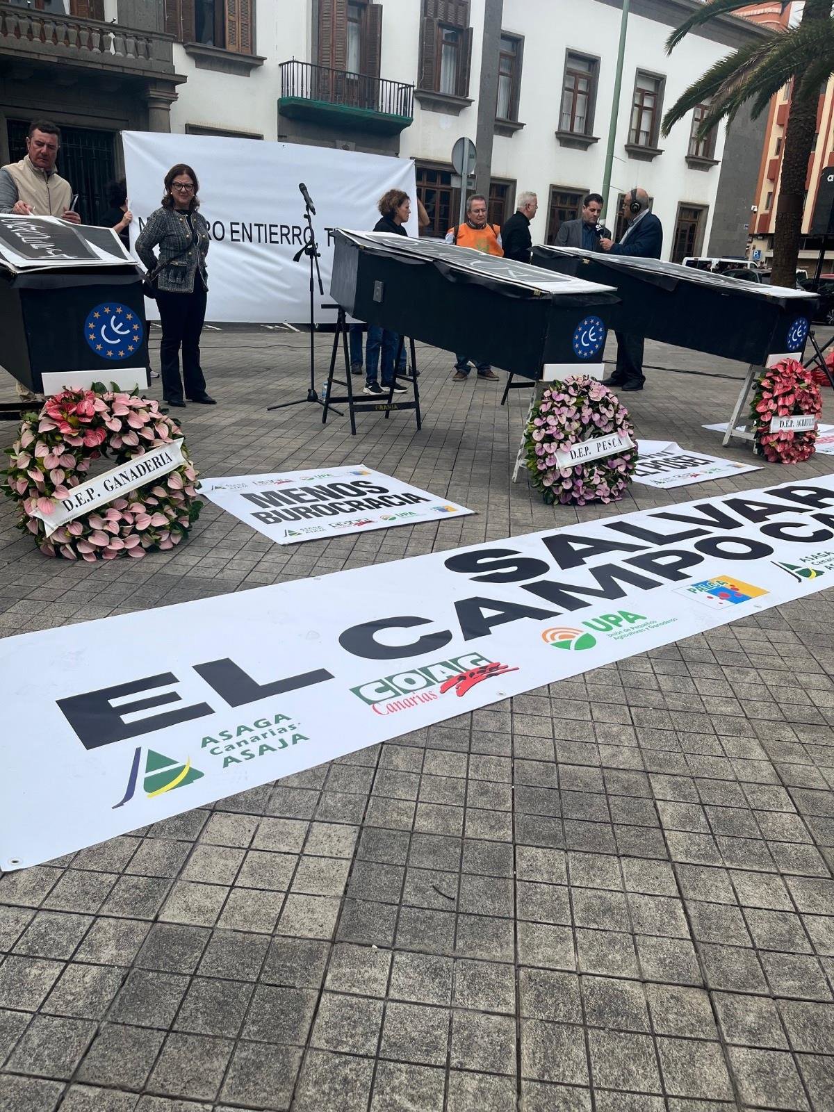 En una concentración frente a la Delegación del Gobierno en Canarias, en Las Palmas de Gran Canaria, se han dado cita representantes de las organizaciones profesionales agrarias ASAGA Canarias, COAG Canarias, UPA Canarias y PALCA junto a las sectoriales ASOCAN, ASPROCAN, TROPICAN y FEDEX, que han simulado un entierro de los tres subsectores: agricultura, ganadería y pesca, como muestra de lo que puede suceder si se hace realidad la política europea que se negocia al respecto.