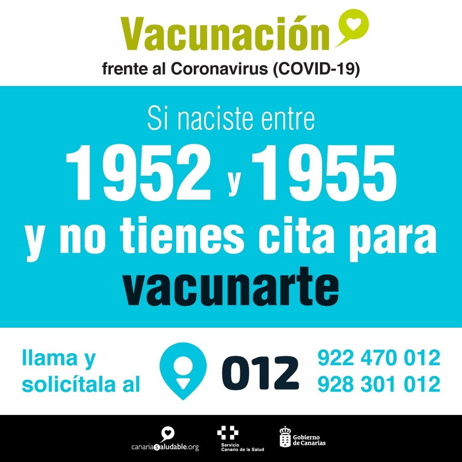 La Consejería de Sanidad del Gobierno de Canarias ha lanzado este viernes una campaña para que los nacidos entre 1952 y 1955, que no hayan sido vacunados aún contra el Covid-19, soliciten cita para ello a través del 012 o llamado al 928 301 012/ 922 470 012.