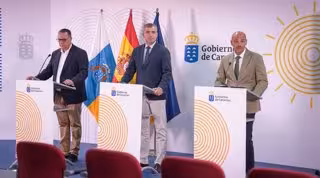 El consejero de Educación del Gobierno de Canarias, Poli Suárez, el vicepresidente de Canarias, Manuel Domínguez, y el portavoz del Gobierno, Alfonso Cabello, en rueda de prensa - GOBIERNO DE CANARIAS