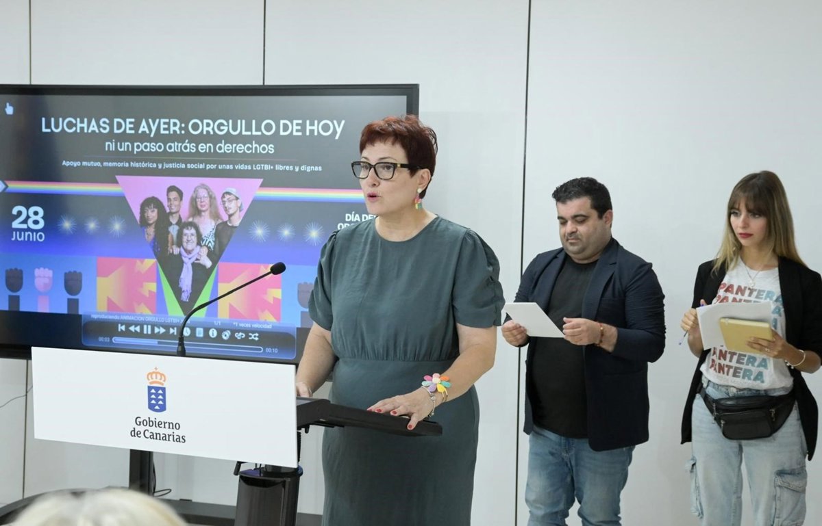 La consejera explicó que el lema del Gobierno de Canarias de este año, enmarcado en su campaña 'Lo natural es la diversidad', es 'Luchas de ayer, orgullo de hoy: ni un paso atrás en derechos', y "pone por lo tanto una especial atención a la importancia de reivindicar el apoyo mutuo, la memoria histórica y la justicia social por unas vidas LGTBIQ+ libres y dignas".