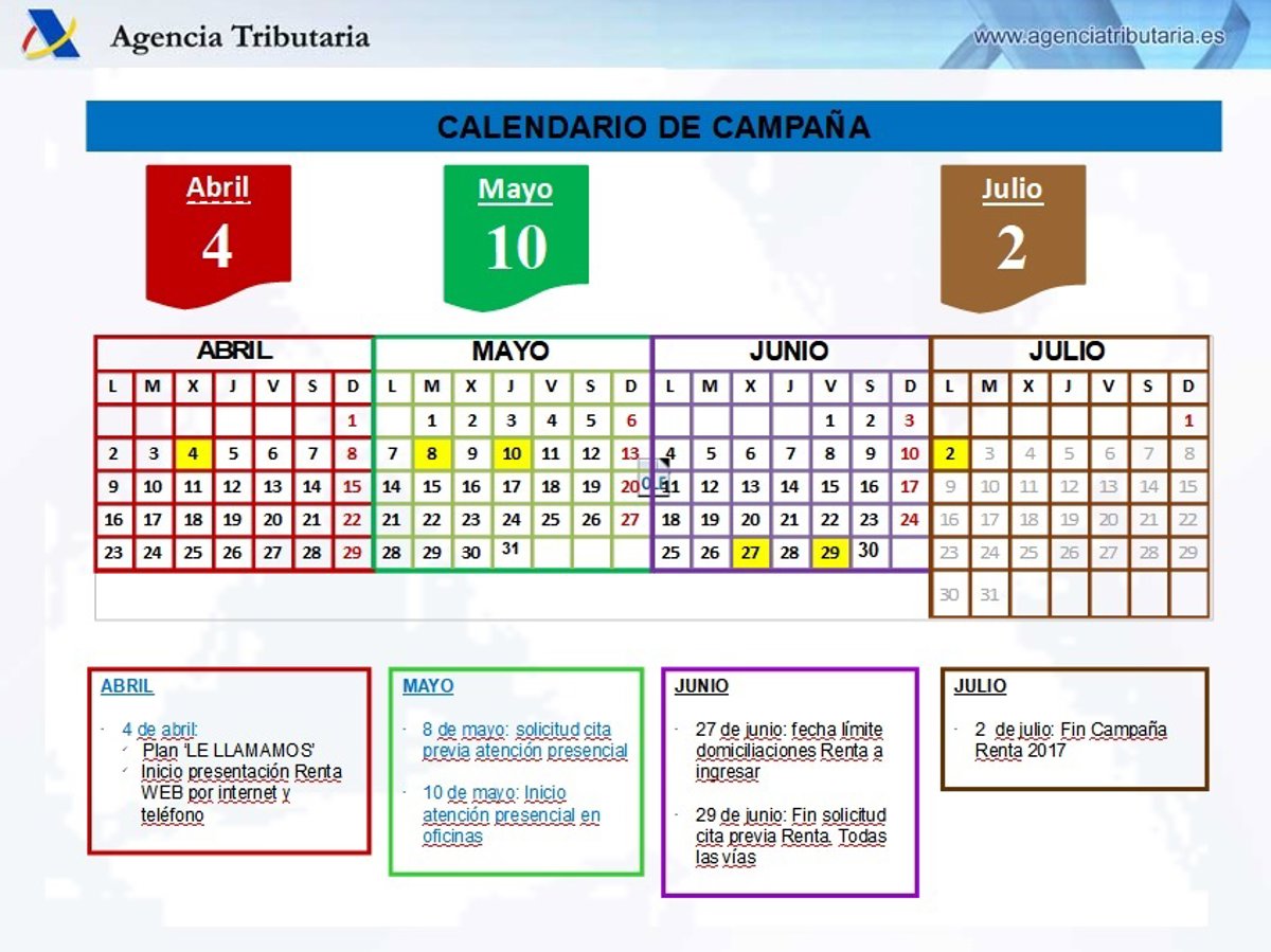 Finalmente se aconsejó consultar el Manuel de Renta de la Agencia Tributaria para conocer todas las deducciones. La campaña de la Renta 2017 concluirá el 2 de julio de 2018 después de comenzar el 4 de abril, desde cuando se pueden presentar las declaraciones vía renta web o por teléfono.