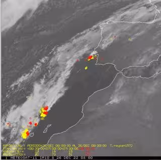 Imagen satélite del canal infrarrojo y descargas eléctricas detectadas en las últimas 2 horas - AEMET