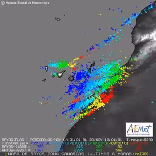 Canarias ha registrado un total de 8.249 rayos durante la madrugada, concretamente, entre las 05.00 horas y las 10.00 horas, según datos de la Agencia Estatal de Meteorología.