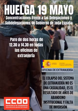 La Federación de Servicios a la Ciudadanía de Comisiones Obreras (FSC-CCOO) ha convocado un paro parcial de dos horas este lunes, entre las 12:30 y las 14:30 horas, en las Oficinas de Extranjería de todo el país.